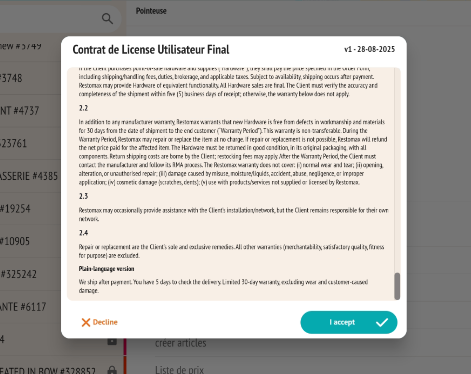 Désormais un Contrat de licence Utilisateur Final (EULA) directement dans le logiciel RESTOMAX.